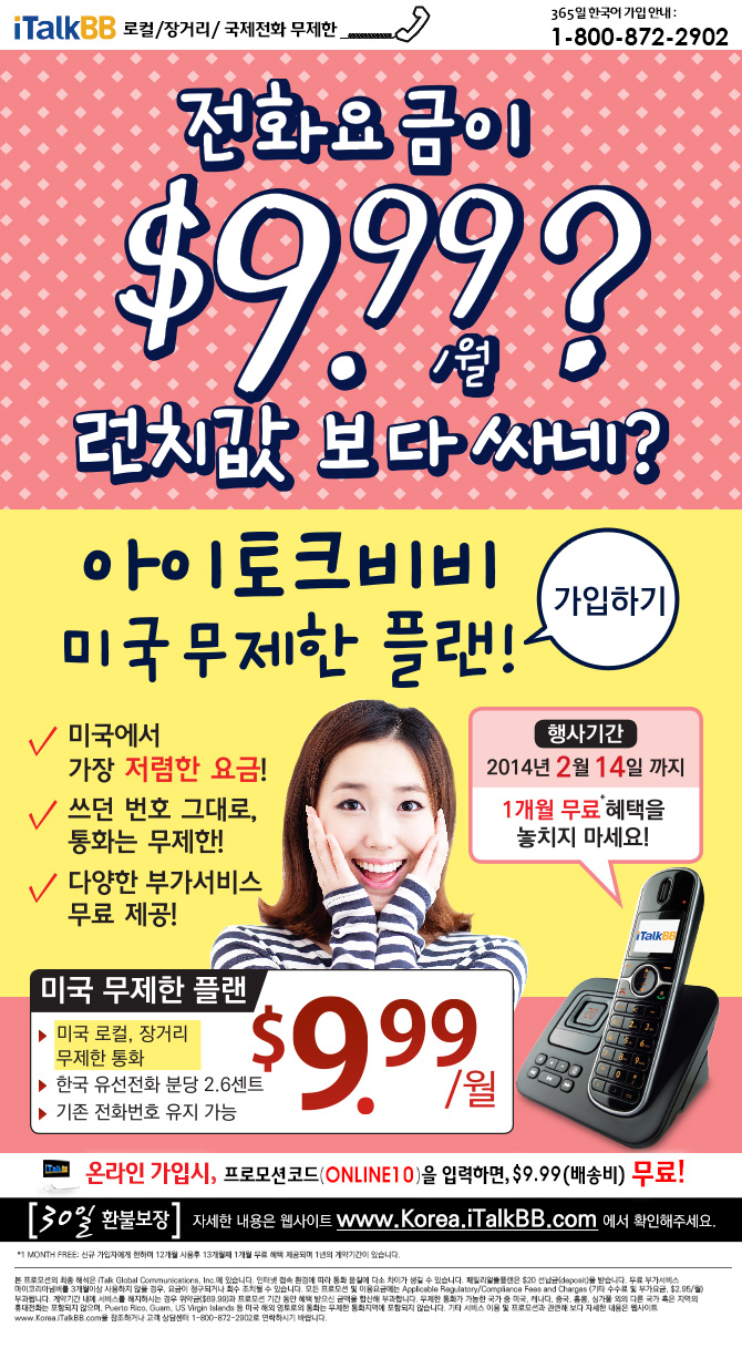 전화요금이 $9.99/월? 런치값 보다 싸네?