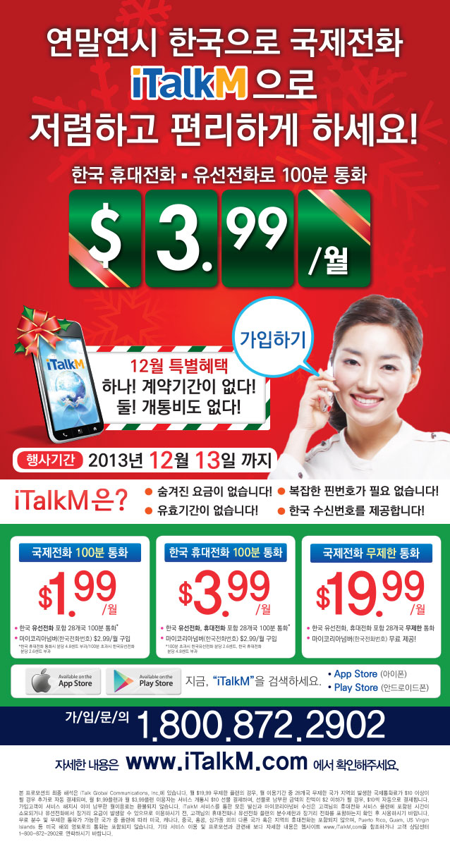 연말연시 한국으로 국제전화 iTalkM으로 저렴하고 편리하게 하세요!