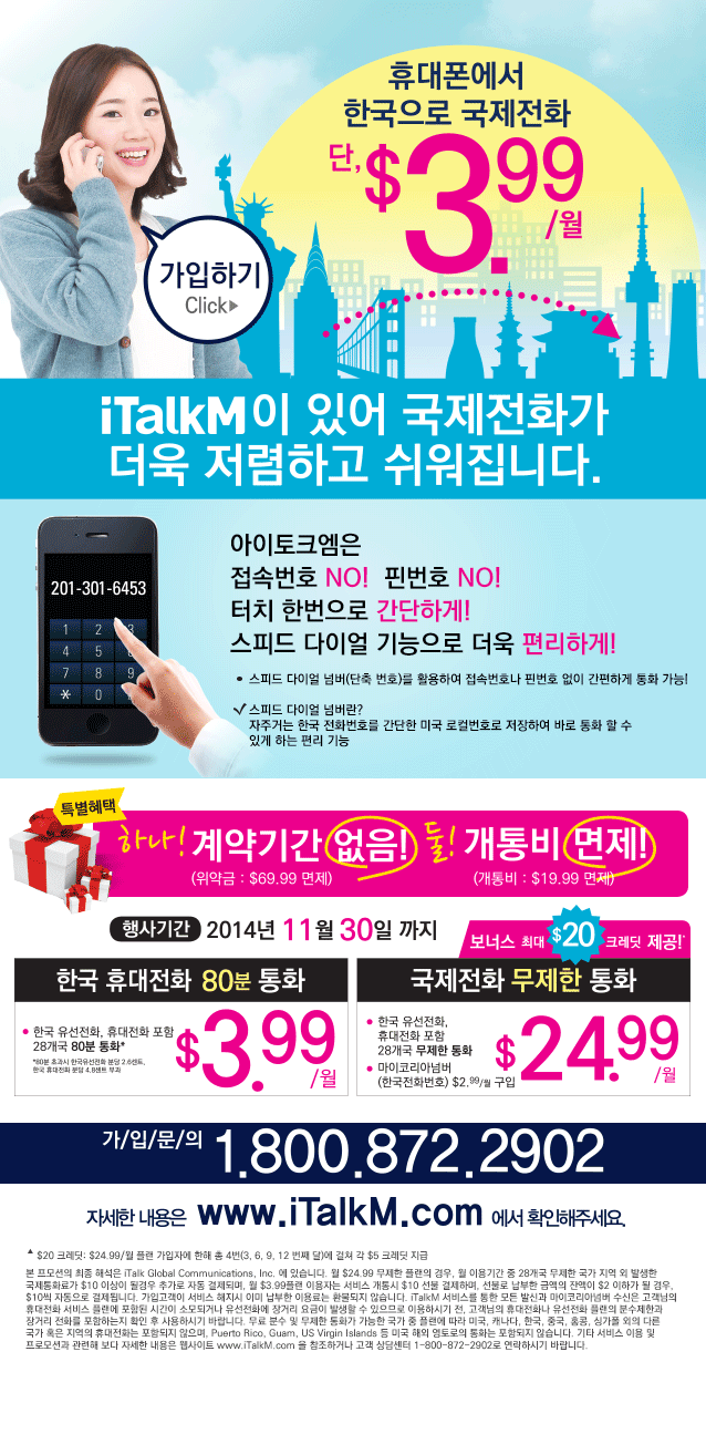 휴대폰에서 한국으로 국제전화 단 $3.99/월