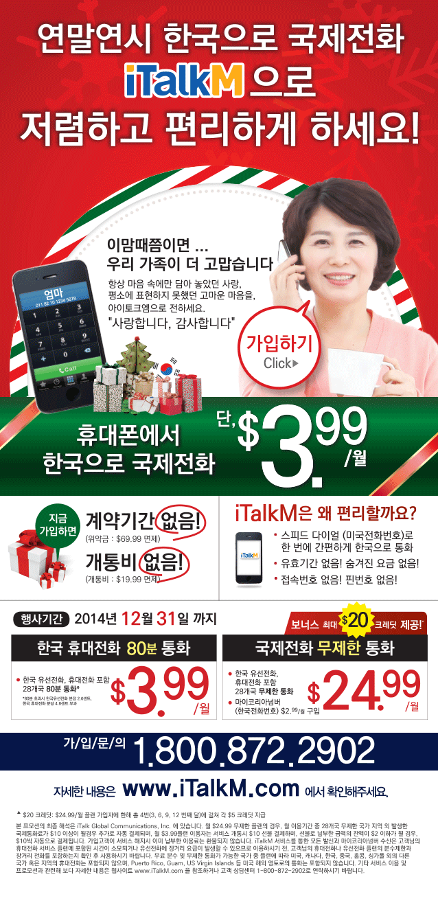 연말연시 한국으로 국제전화 iTalkM으로 저렴하고 편리하게 하세요!