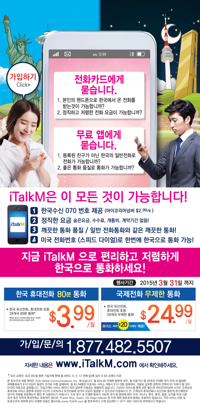 지금 iTalkM으로 편리하고 저렴하게 한국으로 통화하세요!