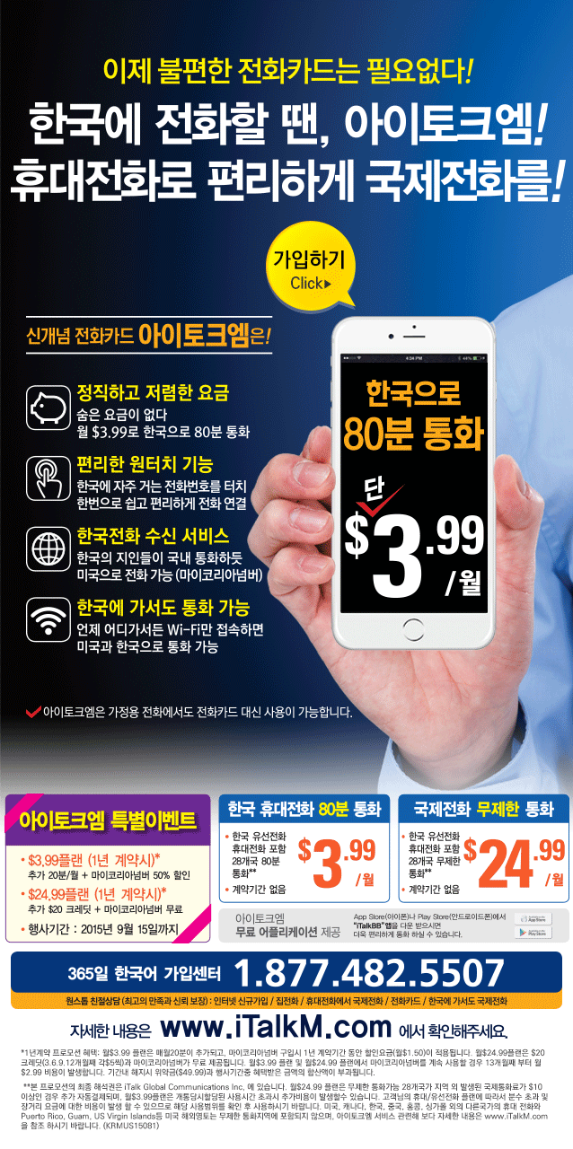 한국으로 전화할 땐,아이토크엠! 휴대전화로 편리하게 국제전화를!