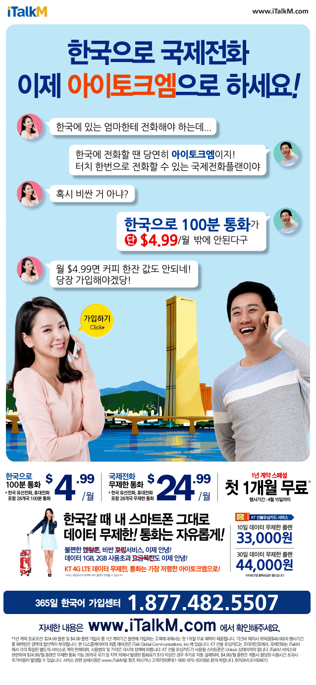 한국으로 국제전화 이제 아이토크엠으로 하세요!