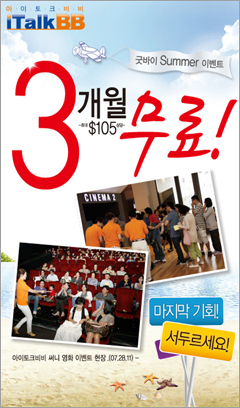 아이토크비비는 기존 AT&T, Verizon, Comcast, Vonage 집전화 대비 저렴한 서비스 요금의 장점 뿐만 아니라 안정적인 통화품질과 365일 한국어 고객지원 서비스 등을 제공 함으로써 한인들의 사랑을 독차지하고 있다. 이에 아이토크비비는 고객 사랑에 대한 감사 표시로 지난 7월 28일 LA 한인타운의 CGV 극장에서 아이토크비비 고객 150명을 초대하여 “써니” 영화 관람 행사를 단독 실시하였으며, 행사장에서 추첨을 통해 노트북등 많은 경품을 지급 한바 있다. 아이토크비비 관계자는 이번 3개월 무료 프로모션은 한시적인 이벤트인 만큼 아이토크비비 가입을 고민하고 있는 소비자나 전화 사용이 많은 분들은 8월31일까지 진행되는 3개월(최대 $105상당) 무료 프로모션을 통해 더욱 부담없는 가격으로 각종 부가서비스는 물론 더 큰 절약의 혜택을 누릴 수 있기를 바란다고 덧붙였다.