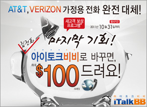 가입 및 프로모션 안내:1-800-872-2902 또는 웹사이트www.Korea.iTalkBB.com