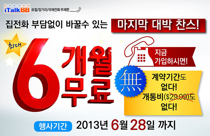 집전화의 대명사, 아이토크 비비 가입을 고려하고 계신 분이라면 언제든지 365일 한국어 고객상담 센터: 1.800.872.2902 (오전9:00~ 새벽1:30 EST, 오전6:00~ 밤10:30 PST,) 및 자세한 내용은 www.Korea.iTalkBB.com에서 확인할 수 있다.