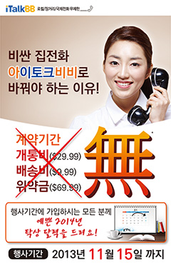 집전화의 대명사, 아이토크 비비 가입을 고려하고 계신 분이라면 언제든지 365일 한국어 고객상담 센터: 1.800.872.2902 (오전9:00~ 새벽1:30 EST, 오전6:00~ 밤10:30 PST,) 및 자세한 내용은 www.Korea.iTalkBB.com 에서 확인할 수 있다.
