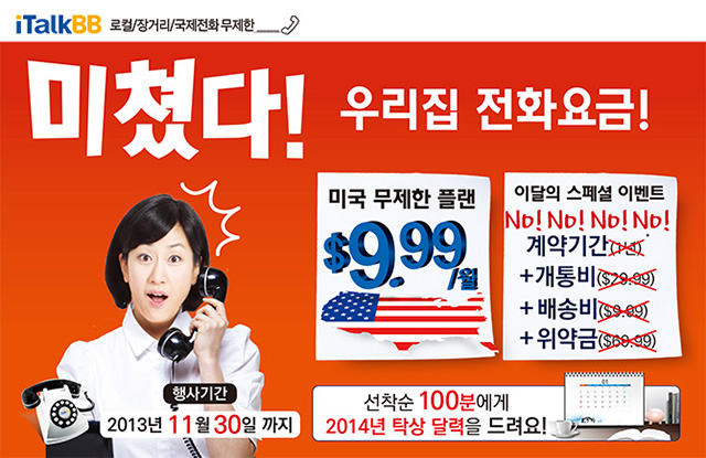 집전화의 대명사, 아이토크 비비 가입을 고려하고 계신 분이라면 언제든지 365일 한국어 고객상담 센터: 1.800.872.2902 (오전9:00~ 새벽1:30 EST, 오전6:00~ 밤10:30 PST,) 및 자세한 내용은 www.Korea.iTalkBB.com에서 확인할 수 있다.