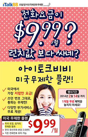 아이토크비비는 신년을 맞이 하여, 신규 가입하는 고객을 대상으로, 플랜에 상관없이 모든 플랜에 1개월 무료 혜택을 드리고 있다. 올한해는 미주 한인들이 아이토크비비를 통해 편안하고 부담없는 집전화를 사용하며 절약을 실천하는 한해로 만들기 바란다. 아이토크비비 서비스에 대한 보다 자세한 내용은 홈페이지를 확인하거나 고객지원센터에 문의할수 있다.