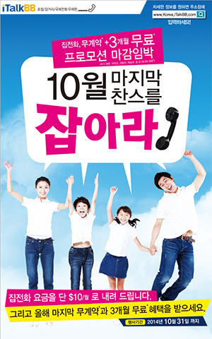 미주 한인들에게 미국 무제한 및 국제전화 무제한 플랜을 통해 자유통화의 기쁨을 제공해온 인터넷 전화 전문기업 아이토크비비가 10월을 맞아 신규 가입자와 기존 이용고객을 대상으로 특별 무료프로모션 및 스페셜이벤트를 진행하고 있다.