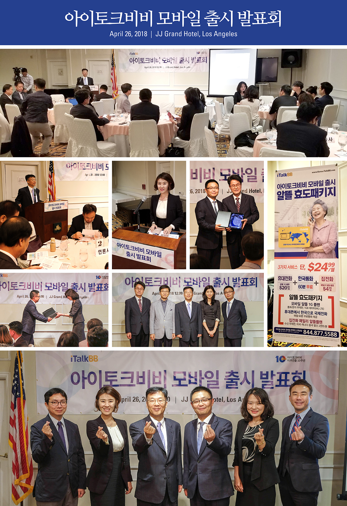 ‘언제 어디서나 어디서나 멋진 이민자 생활’ 이라는 사명 아래 지난 10년간 미주 한인과 함께 성장해 온 아이토크비비에서 새롭게 휴대전화 서비스를 출시하여 2018년 4월 26일 LA 한인타운내 JJ Grand Hotel에서 각 미디어 대표와 한인 인사들을 초청하여 아이토크비비 모바일 서비스 출시 발표회 개최하였다.