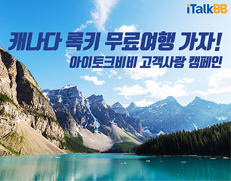 지난 7월 1일부터 시작 된 아이토크비비 고객사랑 캠페인 ‘아름다운 세상 만들기’ 1탄은, 아이토크비비 모든 고객을 대상으로 한분을 추첨하여 가장 소중한 분과 함께 캐나다 록키 4박5일 초특급 여행을 보내는 행사로, 본 이벤트 응모기간인 7월에 신규로 가입한 모든 고객에게는 자동으로 행사 응모자격이 주어져 저렴한 비용으로 아이토크비비 서비스도 이용하고 소중한 분과 함께 캐나다 록키 여행도 공짜로 갈수 있는 절호의 찬스를 잡을 수 있다.