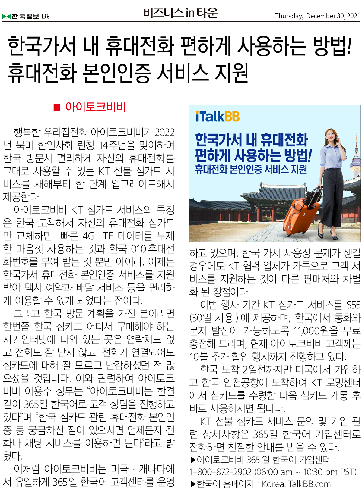 [KT 선불 심카드] 한국가서 내 휴대전화 편하게 사용하는 방법!LA 한국일보 제공 2021년 12월 30일자 기사입니다.