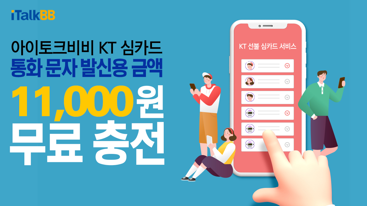 아이토크비비는 이번 가정의 달을 맞이하여 KT 심카드 프리미엄 신버전을 구입하시는 고객에게 한국에서 통화와 문자 발신이 가능하도록 11,000원을 무료 충전해 드릴뿐 아니라 아이토크비비 기존 고객께는 특별히 10불을 추가로 할인해 드리는 특별이벤트를 실시합니다.
