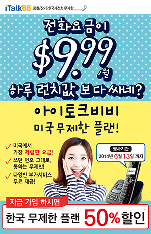 미주 한인들에게 널리 알려진 통신전문업체 아이토크비비가 제공하는 휴대폰용 국제전화 서비스인 iTalkM이 이런 불만을 해소해 준다. 많은 미디어를 통해 우리귀에 익숙한 아이토크비비의 특화된 국제전화 서비스인 iTalkM은 차별화된 서비스와 높은 신뢰도로 한인들사이에 인기가 높다. 특히, 미주내 통신업체중 유일하게 365일 한국어 고객지원센터를 운영하여 한인고객에게 편리한 서비스를 제공하고 있다. iTalkM을 이용하면, “내 휴대폰에서 언제어디서나” 국제통화가 가능하며, 스마트폰 사용자는 무료앱을 활용하여 더욱 업그레이드된 편리함을 만끽할수 있다.