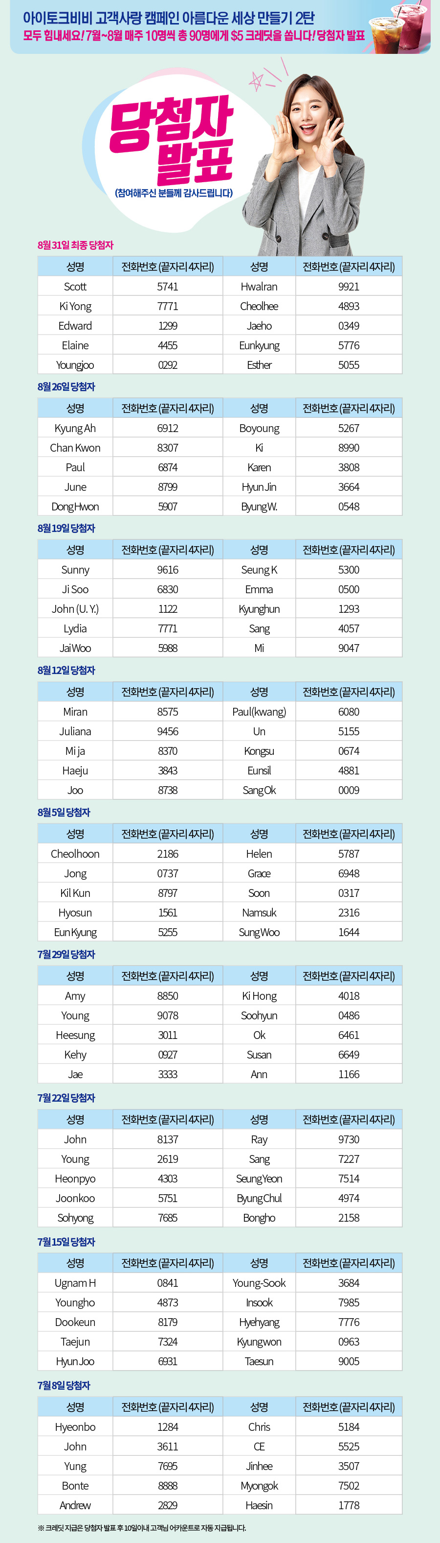아이토크비비 고객사랑 캠페인 아름다운 세상 만들기 2탄 모두 힘내세요! 7월~8월 매주 10명씩 총 90명에게 $5 크레딧을 쏩니다! 당첨자 발표